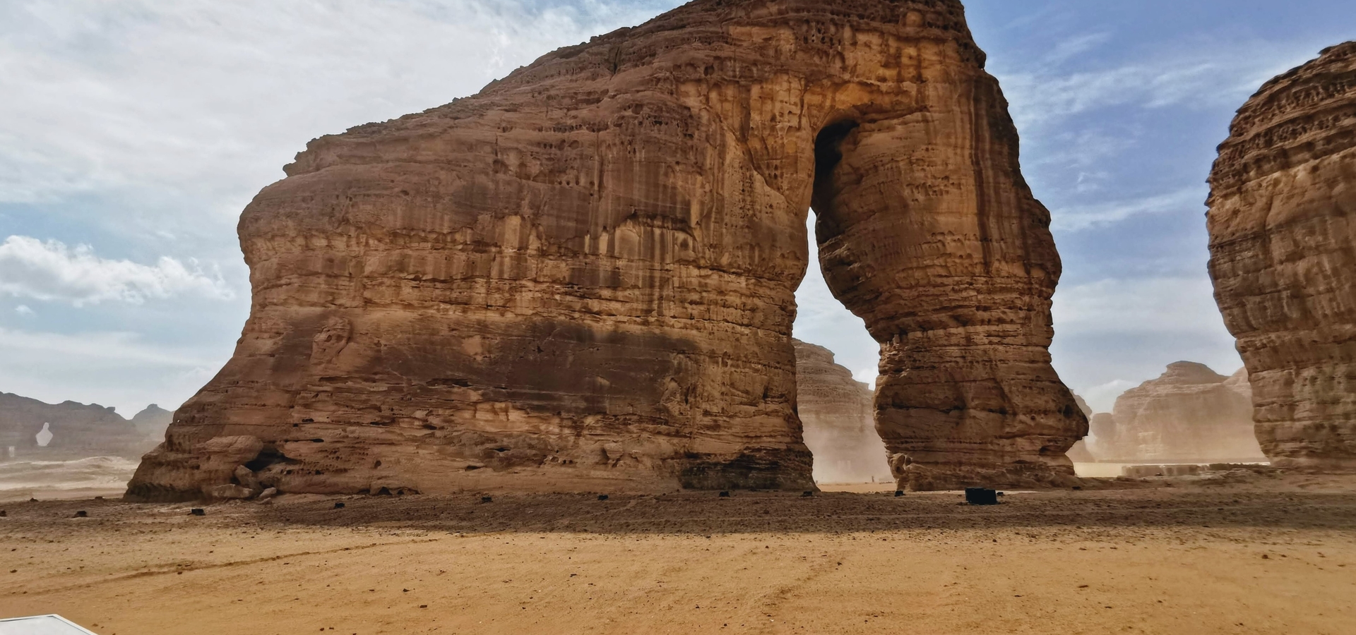 صخرة عملاقة مهيبة التكوين على هيئة فيل ضخم البنية، أبدع المصورون في التقاط صورها من مختلف الزوايا، حتى أصبحت مقصد كل عابر بالعلا. فنُصبت الجلسات وأماكن الاستراحة في محيطها، والأضواء التي تبرز جمال التكوين الصخري ليلاً، ليستأنس الزوار بجمال طبيعة العلا وصخرة الفيل. ومن الأعلى تتبدى صخرة الفيل مع كتل صخرية موزعة على الميدان الصحراوي بالحجم نفسه تقريبًا، تبدو وكأنها عائلة من الفيلة في رحلتها عبر البيئة الصحراوية.