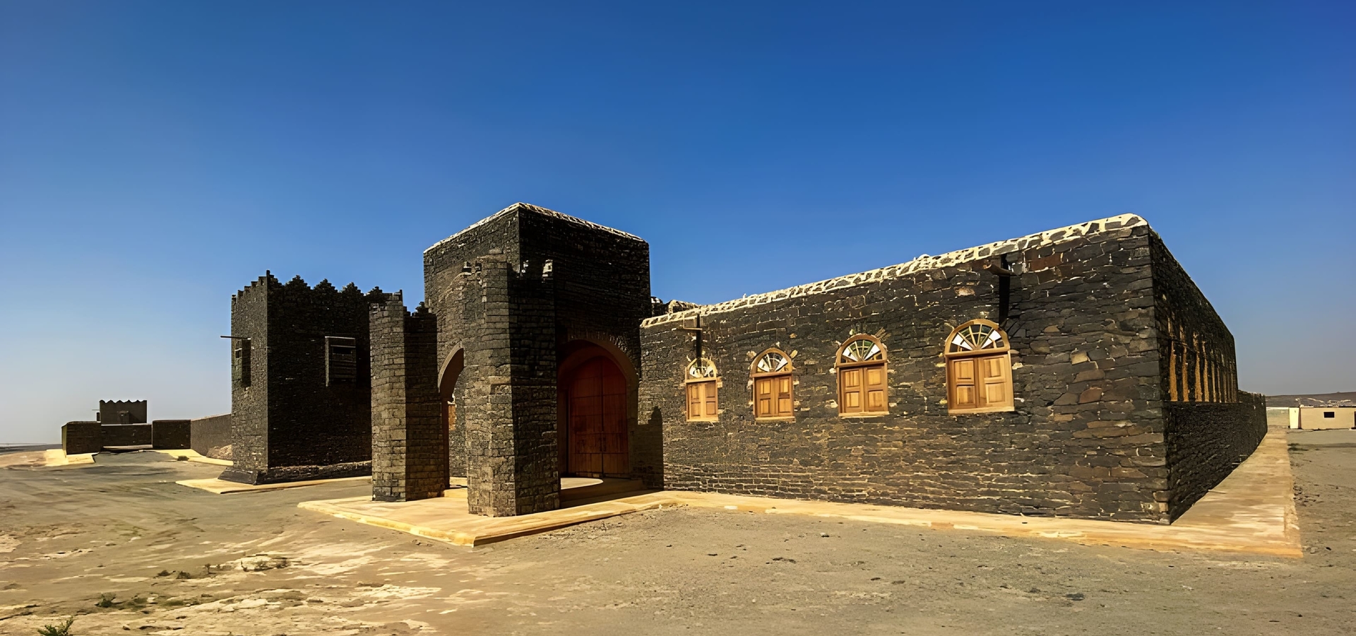 يزدان القصر بمقصورة ملكية، وقاعة للتشريفات واستقبال الضيوف، وغرف أخرى للشخصيات البارزة والمرافقين. كما توجد أبراج مراقبة تعلو السور المبني من الحجارة السوداء، وقلعتان من الجهتين الشمالية والشرقية.