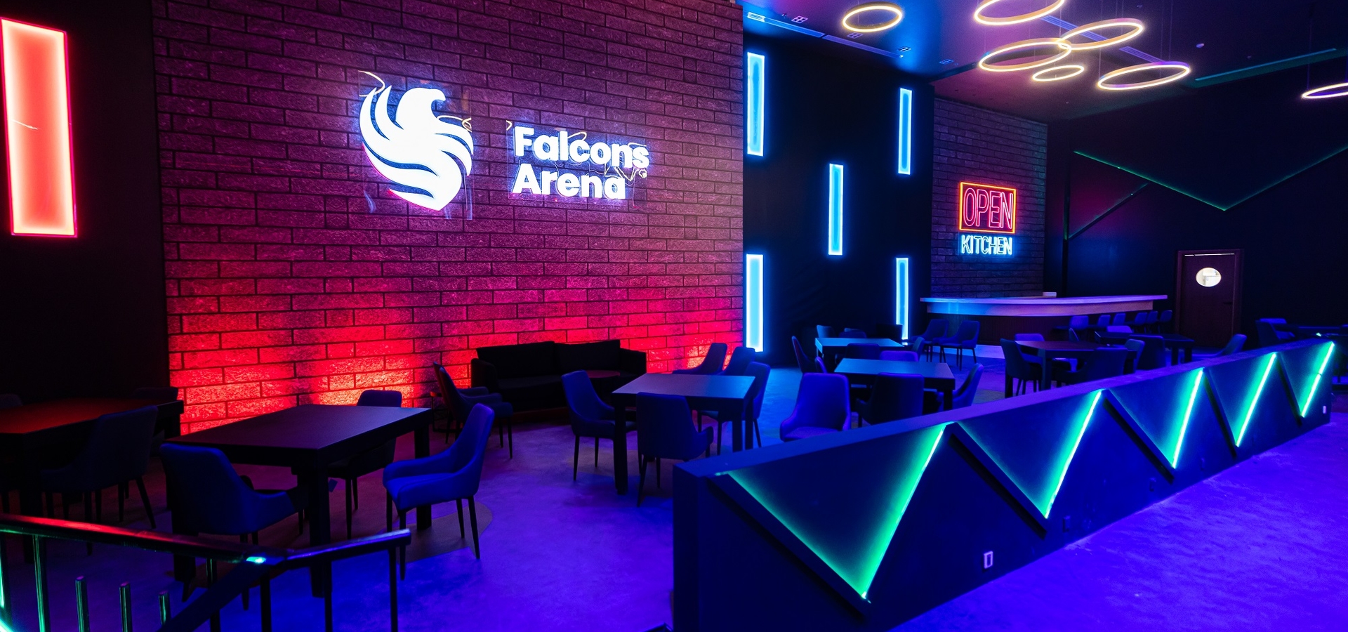 وتحتضن المنطقة الأولى فالكونز أرينا عددًا من بطولات الألعاب الإلكترونية ومقابلة مؤثري وصانعي المحتوى المفضّلين لديهم من فريق فالكونز، إلى جانب عروض الطهي كأحد فعاليات الفريق الجانبية. ويُضاف إلى ذلك، منطقة حي فالكونز التي تضم متجرًا لمعجبي فريق فالكونز والألعاب الإلكترونية ومركزًا للعب بأقوى أجهزة الحاسب الشخصي، ومتحفًا يستعرض جميع الإنجازات التي حققها فريق فالكونز، وأكاديمية "تعلّم لتُصبح محترفًا"، ومنطقة البث المباشر التي يرتادها فريق فالكونز للبث عبر قنواتهم.