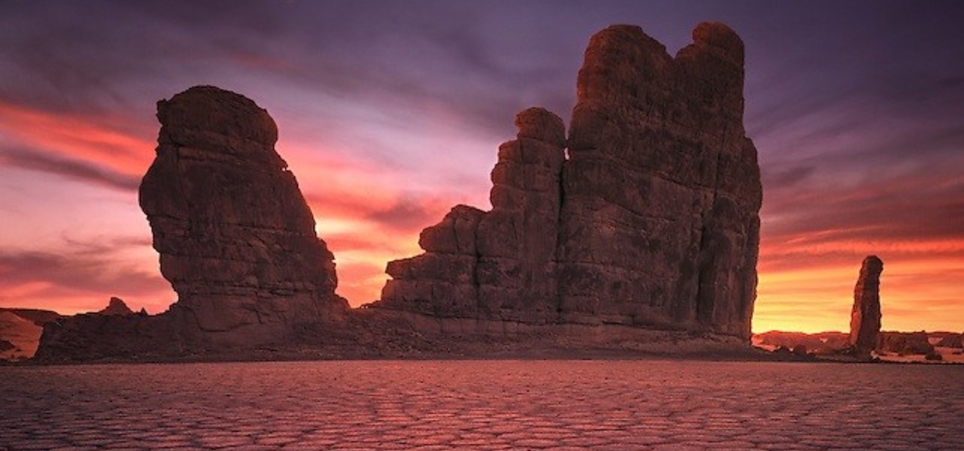 كثيرًا ما تجتمع التضاريس الغرائبية مع غروب الشمس في منطقة تدعى قاع الصنيع في منطقة برية من محافظة العلا، لتشكل ترفا مبهرًا من الصعب تجاوز منظره.