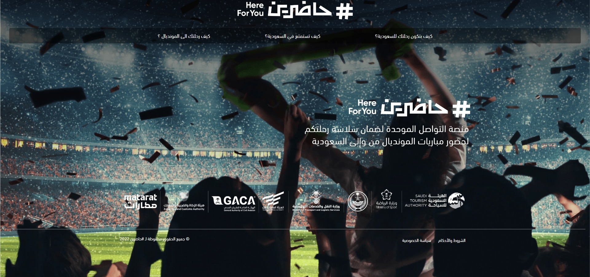 في سبيل ذلك، أطلقت الهيئة السعودية للسياحة منصة "حاضرين"، وهي منصة تواصل موحدة ترمي إلى توفير الخدمات الإسنادية للمواطنين والمقيمين والسائحين داخل المملكة ممن يرغبون في حضور مباريات وفعاليات كأس العالم 2022، والاستمتاع بزيارة الوجهات السياحية السعودية.