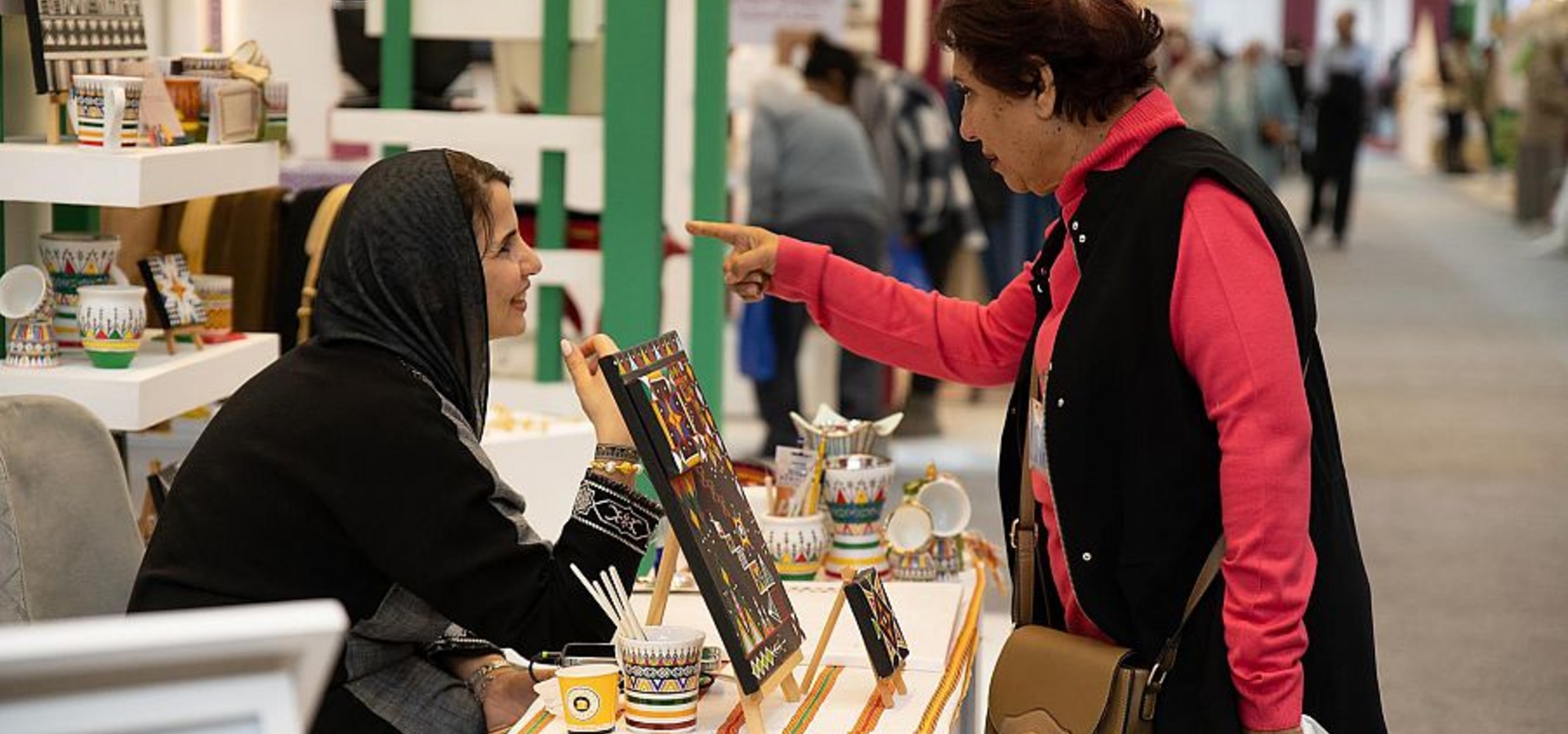 أثار "فن القط" انبهار الضيوف في المعرض العربي للأسر المنتجة المقام حاليًا في القاهرة، حيث استمتعوا بهذا الفن السعودي الشهير الذي تقدمه المرأة في منطقة عسير والذي جرى تطويره من مجرد نقوش تزين جدران المنازل إلى منتجات تستلهم ألوان الطبيعة وتعرّف الجميع بالموروث الثقافي الأصيل.